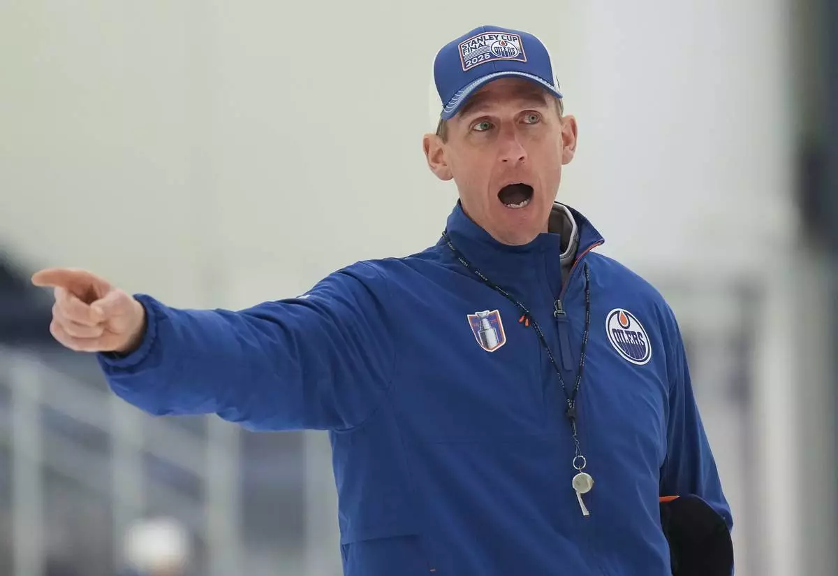 Edmonton Oilers head coach Kris Knoblauch yells during practice at the NHL Stanley Cup Finals in Fort Lauderdale, Fla., Tuesday, June 10, 2025.(Nathan Denette/The Canadian Press via AP)