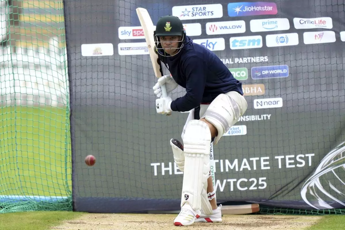 South Africa's Tristan Stubbs attends a nets session at Lord's, London, Tuesday June 10, 2025. (Ben Whitley/PA via AP)