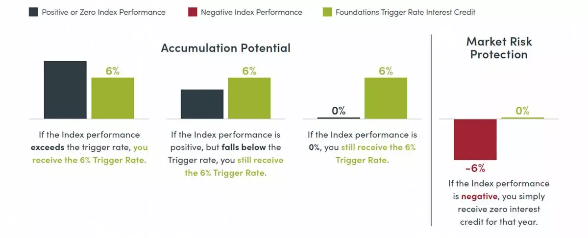 Additionally, Security Benefit has added a straightforward crediting strategy for clients benchmarked against the S&P 500. With the new Annual Point to Point Trigger Rate strategy, a Trigger Rate is established at term (6% is used as an example in the graph), and Index performance of 0% or higher credits the stated Trigger rate.