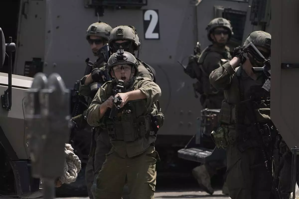 An Israeli soldier points his weapon during a military raid in the West Bank city of Nablus, Tuesday, June 10, 2025. (AP Photo/Majdi Mohammed)