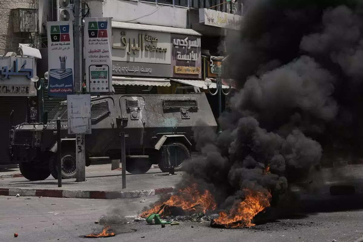 An Israeli armoured vehicle drives near burning tires during a military raid in the West Bank city of Nablus, Tuesday, June 10, 2025. (AP Photo/Majdi Mohammed)