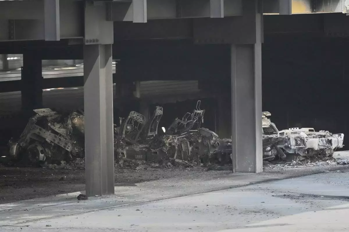 Burned vehicles are seen inside a garage that caught fire and a floor of the structure collapsed Tuesday, June 10, 2025, in Nashville, Tenn. (AP Photo/George Walker IV)