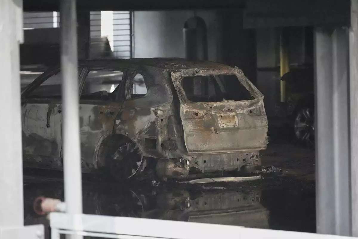 A burned vehicle is seen inside a garage that caught fire and a floor of the structure collapsed Tuesday, June 10, 2025, in Nashville, Tenn. (AP Photo/George Walker IV)