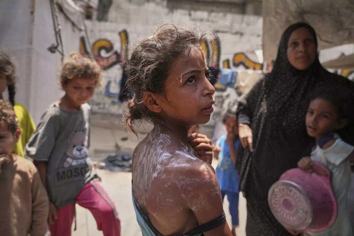 Rital Abu Jari, 9, stands after receiving cream to relieve burns on her back and shoulder, which she suffered while trying to get warm donated food at a community kitchen in Gaza City, Tuesday, June 10, 2025. (AP Photo/Jehad Alshrafi)