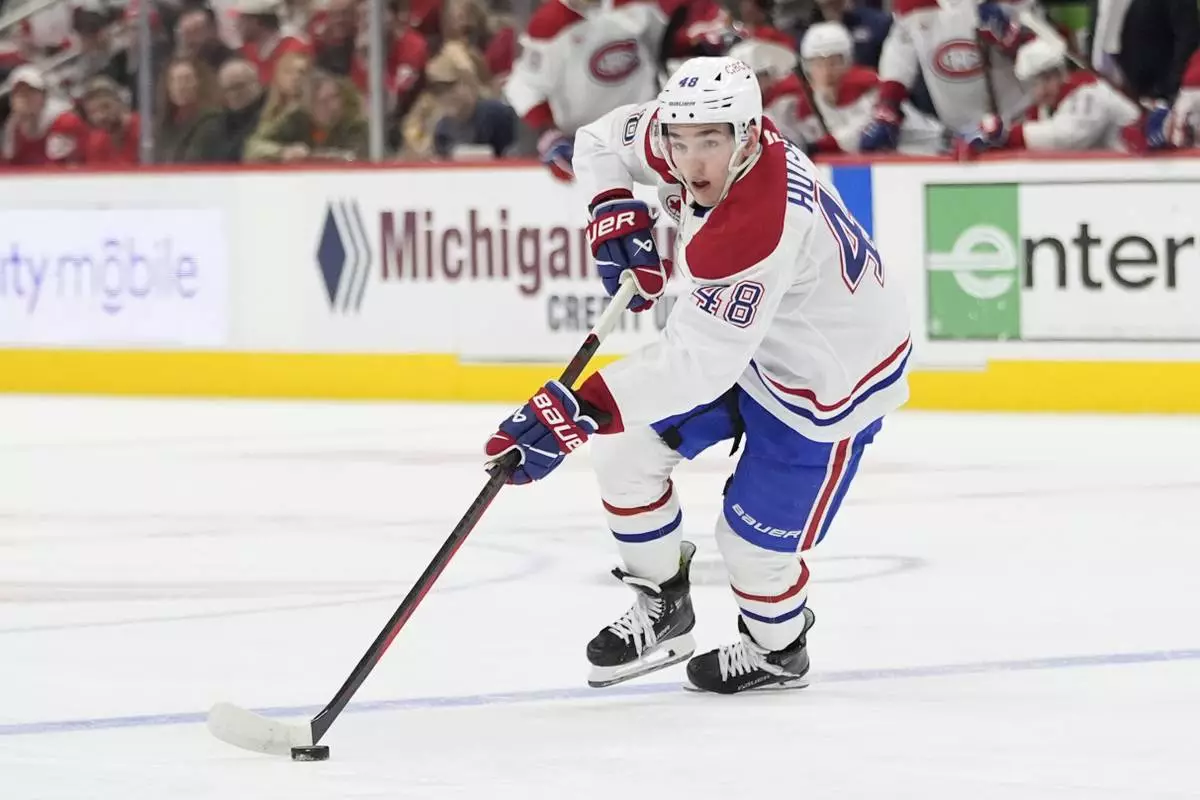 FILE - Montreal Canadiens defenseman Lane Hutson (48) controls the puck during the first period of an NHL hockey game against the Detroit Red Wings, Friday, Dec. 20, 2024, in Detroit. (AP Photo/Carlos Osorio, File)