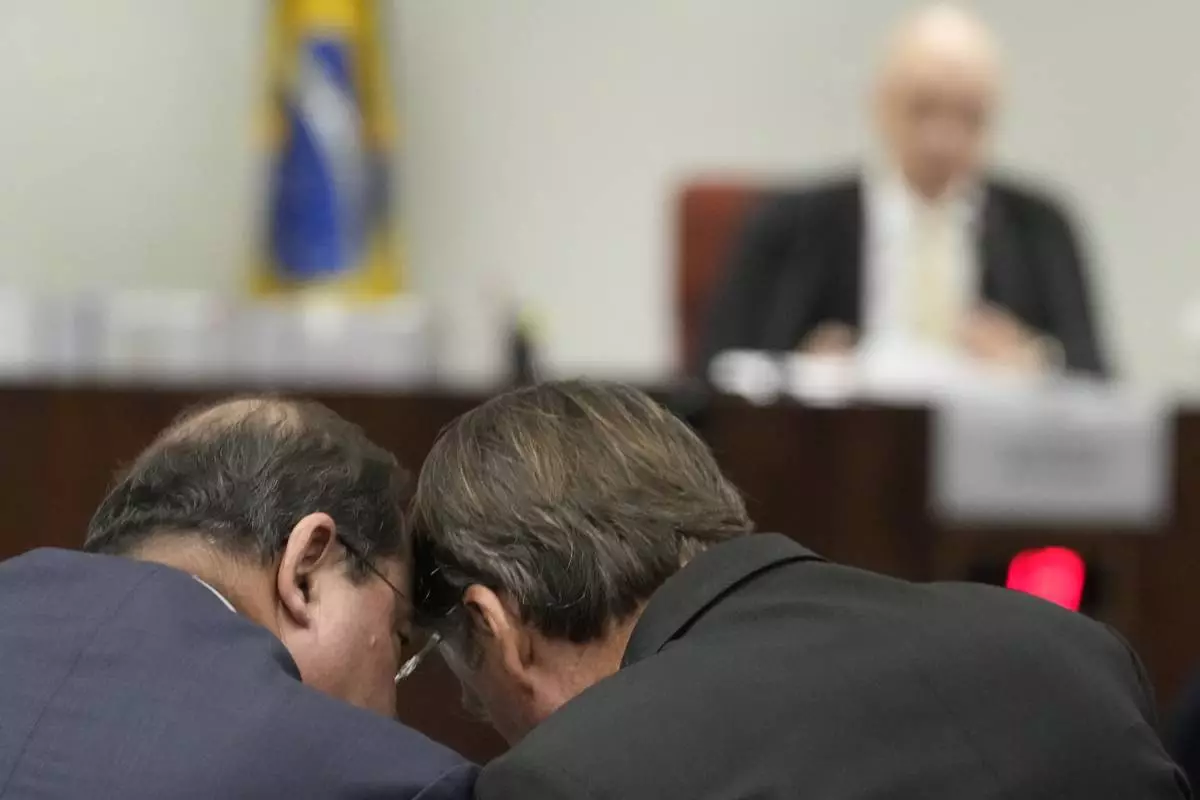 Brazil's former President Jair Bolsonaro, right, talks with his lawyer as he sits before Supreme Court Judge Alexandre de Moraes during his trial, along with others, charged with an alleged coup plot to keep him in office after his 2022 election defeat, in Brasilia, Brazil, Tuesday, June 10, 2025. (AP Photo/Eraldo Peres)