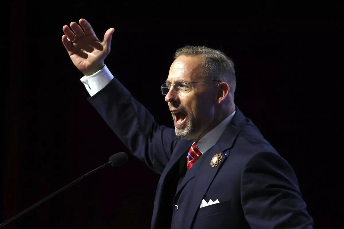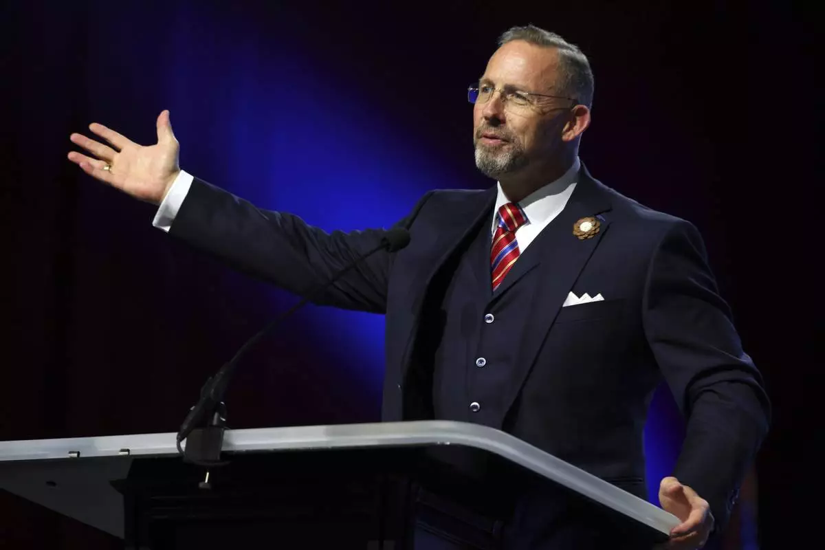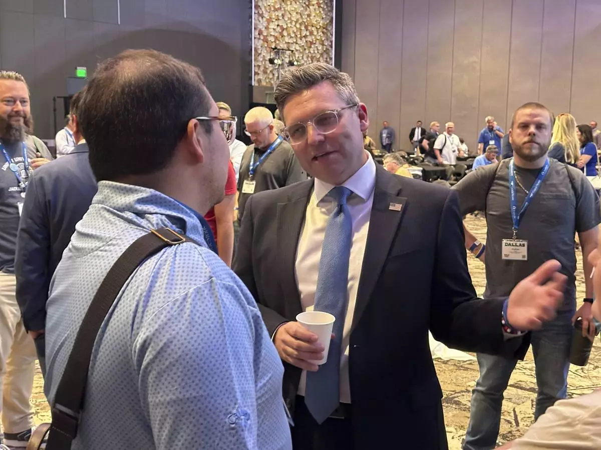 Brent Leatherwood, president of the Ethics and Religious Liberty Commission, greets a well-wisher after a commission-sponsored lunch at the annual meeting of the Southern Baptist Convention at the Kay Bailey Hutchison Convention Center in Dallas, Texas, Tuesday, June 10, 2025. (AP Photo/Peter Smith)