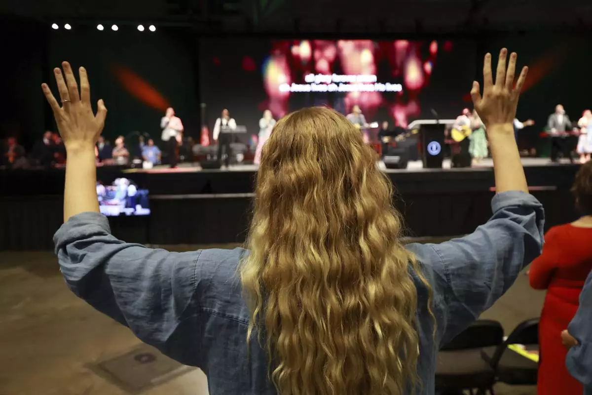 A messenger attending the Southern Baptist Convention participates in worship during the 2025 SBC Annual Meeting, Tuesday, June 10, 2025, in Dallas. (AP Photo/Richard W. Rodriguez)