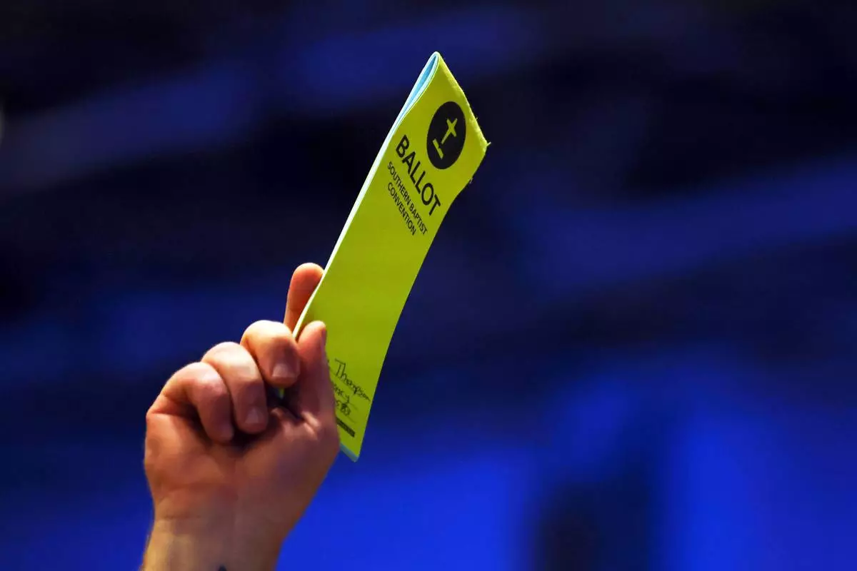 A messenger attending the Southern Baptist Convention raises his ballot to vote during the 2025 SBC Annual Meeting, Tuesday, June 10, 2025, in Dallas. (AP Photo/Richard W. Rodriguez)