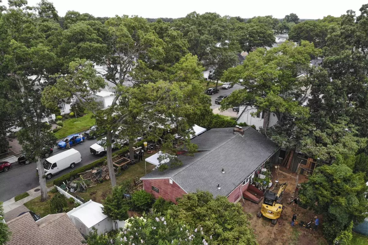 FILE - Authorities work at the home of suspect Rex Heuermann, bottom right, in Massapequa Park, N.Y., July 24, 2023. Heuermann has been charged with killing at least three women in the long-unsolved slayings known as the Gilgo Beach killings. (AP Photo/Seth Wenig, File)
