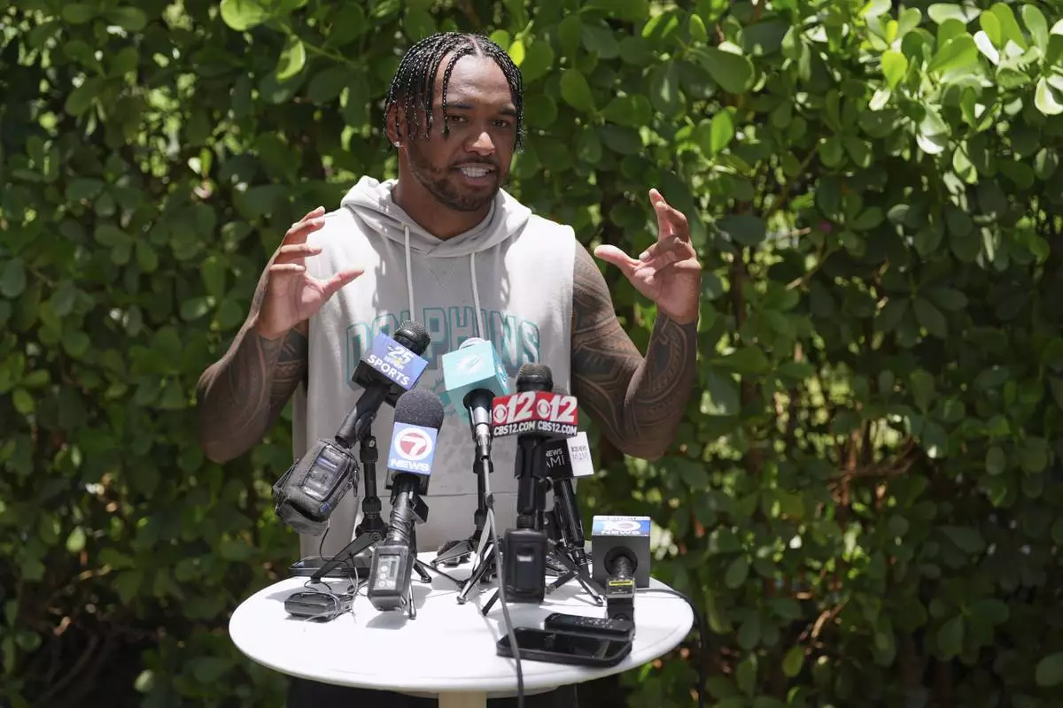 Miami Dolphins quarterback Tua Tagovailoa speaks to the press after a practice at NFL football minicamp, Tuesday, June 10, 2025, in Miami Gardens, Fla. (AP Photo/Rebecca Blackwell)