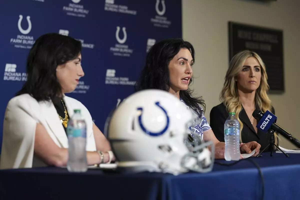 Indianapolis Colts owners Carlie-Irsay Gordon, center, is joined by her sisters Casey Foyt, right, and Kalen Jackson, as they discuss the team during a press conference at the NFL football team's training facility in Indianapolis, Tuesday, June 10, 2025. (AP Photo/Michael Conroy)