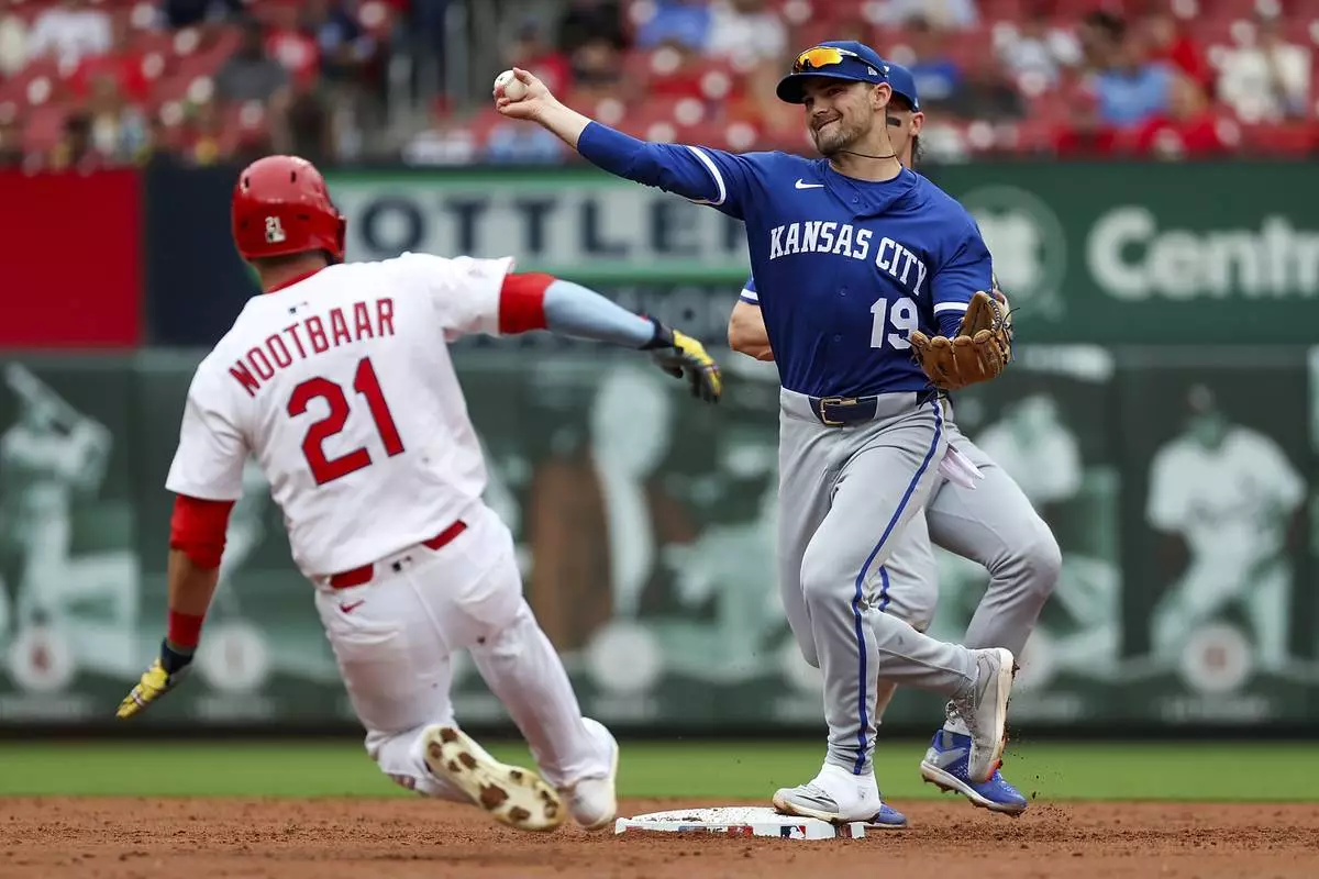 Kansas City Royals' Michael Massey turns a double play over St. Louis Cardinals' Nootbaar (21) during the third inning in the first baseball game of a doubleheader, Thursday, June 5, 2025, in St. Louis. (AP Photo/Scott Kane)