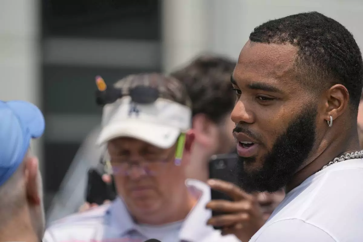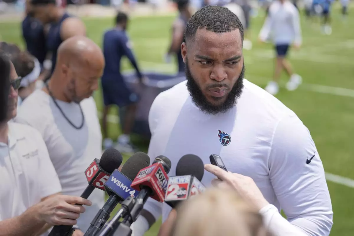 Tennessee Titans defensive tackle Jeffery Simmons speaks during a news conference after practice at NFL football minicamp, Tuesday, June 10, 2025, in Nashville, Tenn. (AP Photo/George Walker IV)
