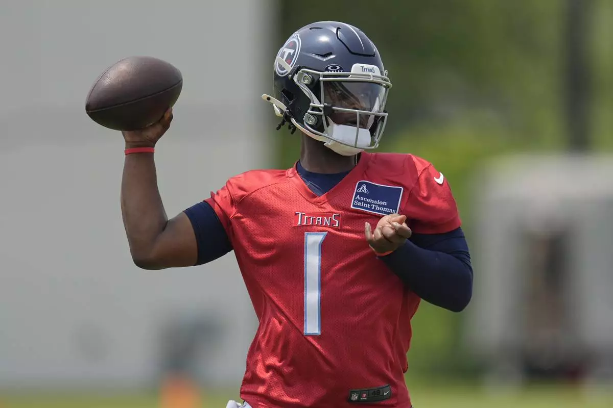 Tennessee Titans quarterback Cam Ward (1) looks to throw a pass during practice at NFL football minicamp, Tuesday, June 10, 2025, in Nashville, Tenn. (AP Photo/George Walker IV)
