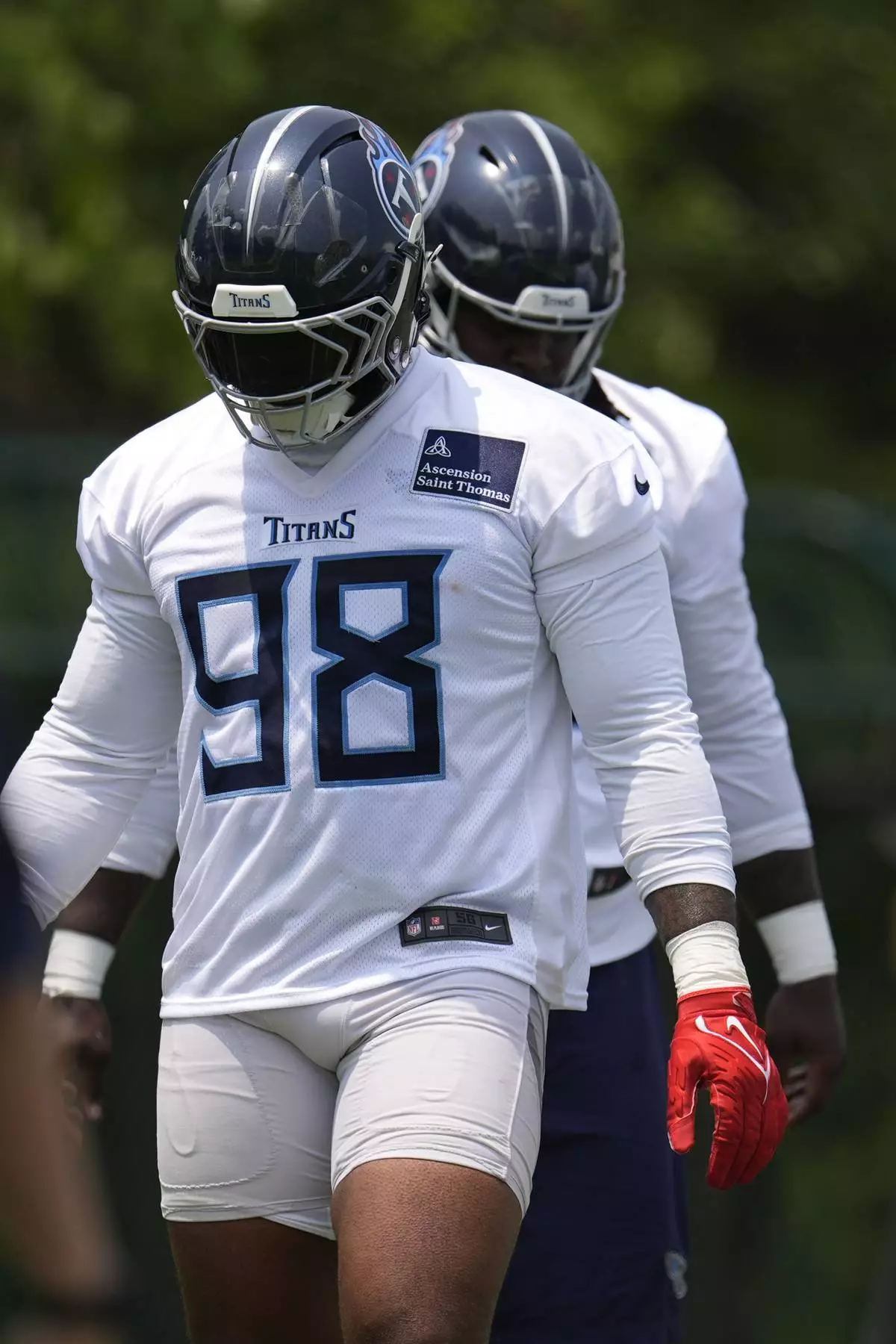 Tennessee Titans defensive tackle Jeffery Simmons (98) walks to the next drill during practice at NFL football minicamp Tuesday, June 10, 2025, in Nashville, Tenn. (AP Photo/George Walker IV)