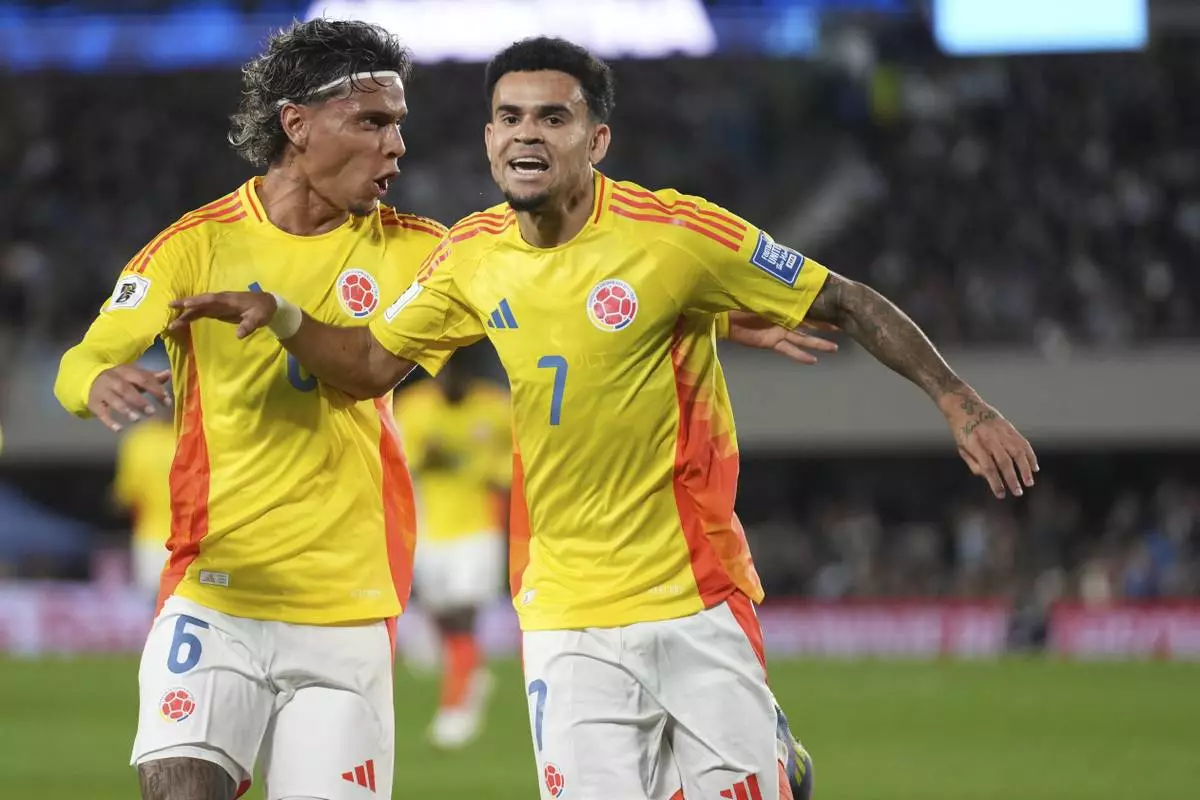 Colombia's Luis Diaz, right, celebrates scoring his side's opening goal against Argentina during a qualifying soccer match for the FIFA World Cup 2026 at the Monumental stadium in Buenos Aires, Argentina, Tuesday, June 10, 2025. (AP Photo/Gustavo Garello)