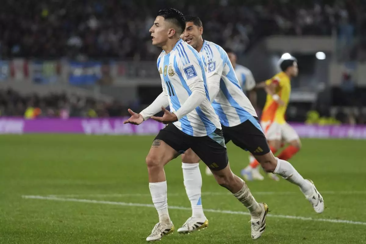 Argentina's Thiago Almada celebrates scoring his side's first goal against Colombia during a qualifying soccer match for the FIFA World Cup 2026 at the Monumental stadium in Buenos Aires, Argentina, Tuesday, June 10, 2025. (AP Photo/Gustavo Garello)