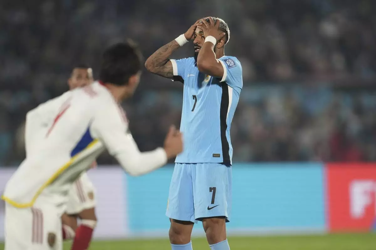 Uruguay's Rodrigo Aguirre, reacts after missing a chance during a qualifying soccer match against Venezuela for the FIFA World Cup 2026 at Centenario Stadium in Montevideo, Uruguay, Tuesday, June 10, 2025. (AP Photo/Matilde Campodonico)