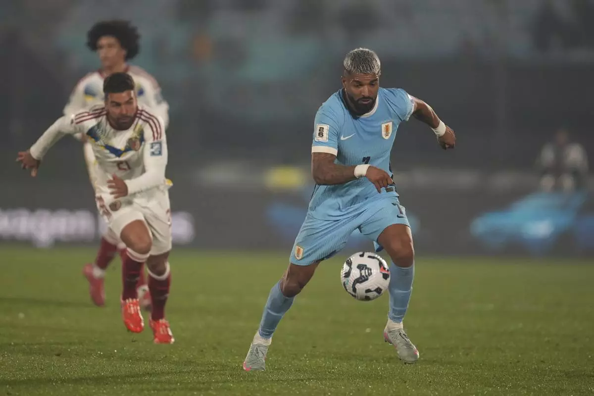 Uruguay's Rodrigo Aguirre carries the ball as Venezuela's Alexander Gonzalez follows during a qualifying soccer match for the FIFA World Cup 2026 at Centenario Stadium in Montevideo, Uruguay, Tuesday, June 10, 2025. (AP Photo/Matilde Campodonico)
