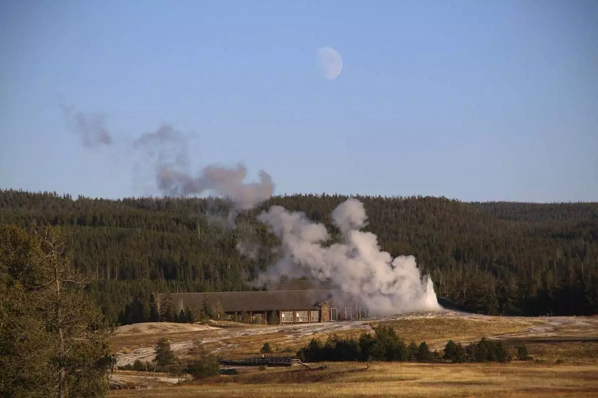 Old Faithful is seen erupting from a distance as the moon rises over the Upper Geyser Basin at Yellowstone National Park, Mont., Sept. 25, 2023. (AP Photo/Hannah Schoenbaum)