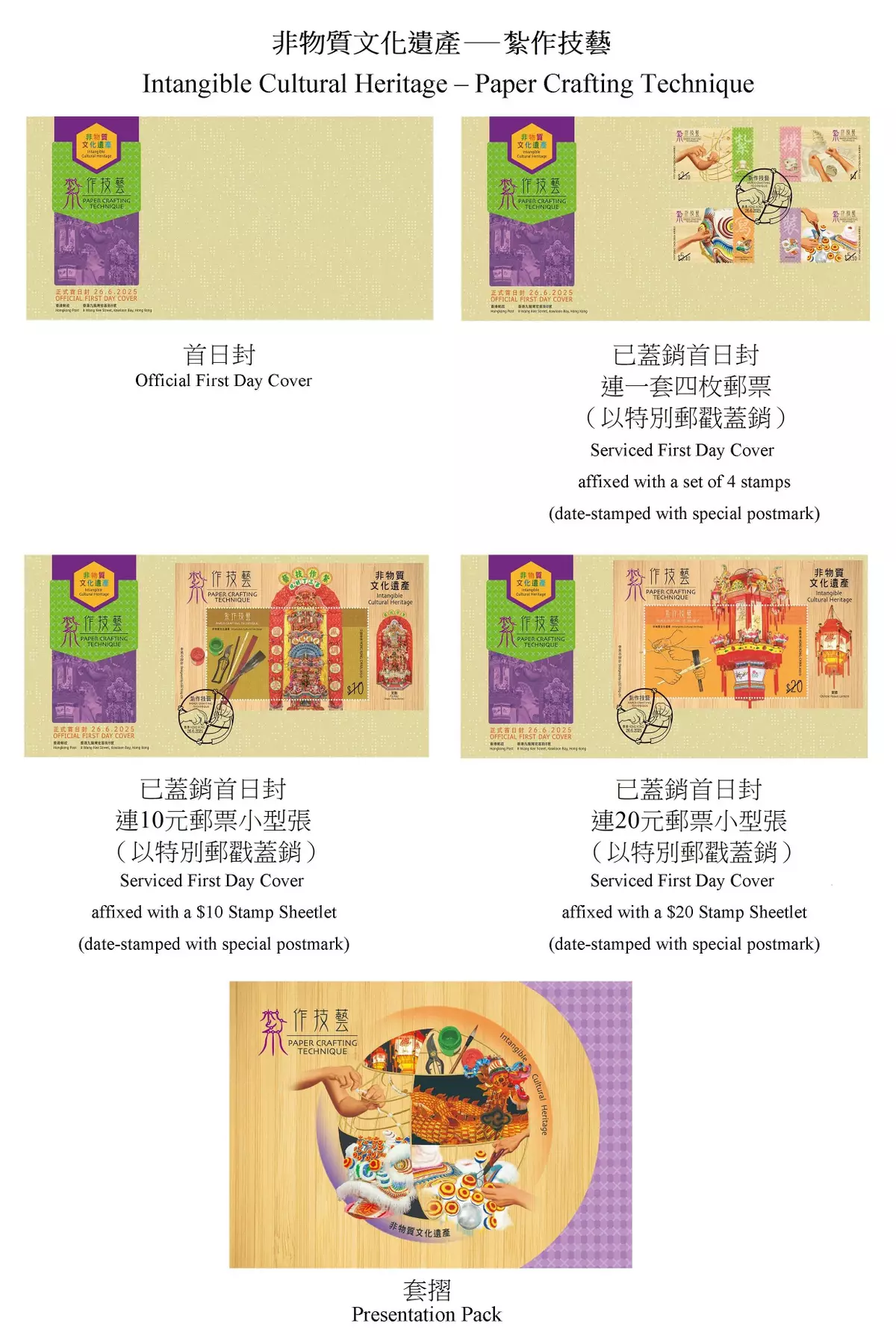 To promote this intangible cultural heritage of Hong Kong, Hongkong Post will issue a set of four stamps, two stamp sheetlets and associated philatelic products on the theme of "Intangible Cultural Heritage - Paper Crafting Technique" to enhance public knowledge of this traditional craftsmanship.
