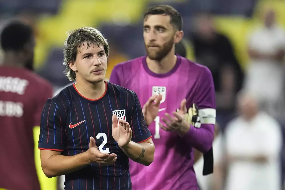 United States defender John Tolkin (2) and goalkeeper Matt Turner (1) applaud the fans after the team's loss in an international friendly soccer match against the Switzerland, Tuesday, June 10, 2025, in Nashville, Tenn. (AP Photo/George Walker IV)