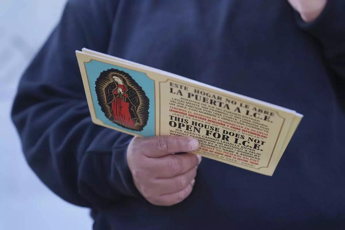 FILE - A woman outside Ambiance Apparel holds a card about Immigration and Customs Enforcement after authorities conducted an operation, Friday, June 6, 2025, in Los Angeles. (AP Photo/Jae C. Hong, File)