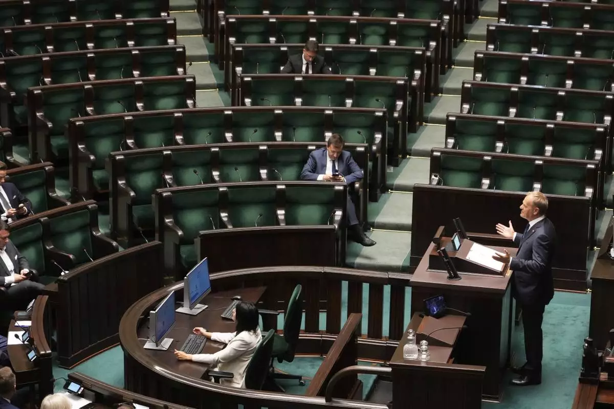 In a sign of those divisions, half of the parliament hall was empty on Wednesday morning when Tusk gave his address, with many lawmakers from the right-wing Law and Justice party boycotting his speech. Tusk said their absence showed disrespect to the nation.