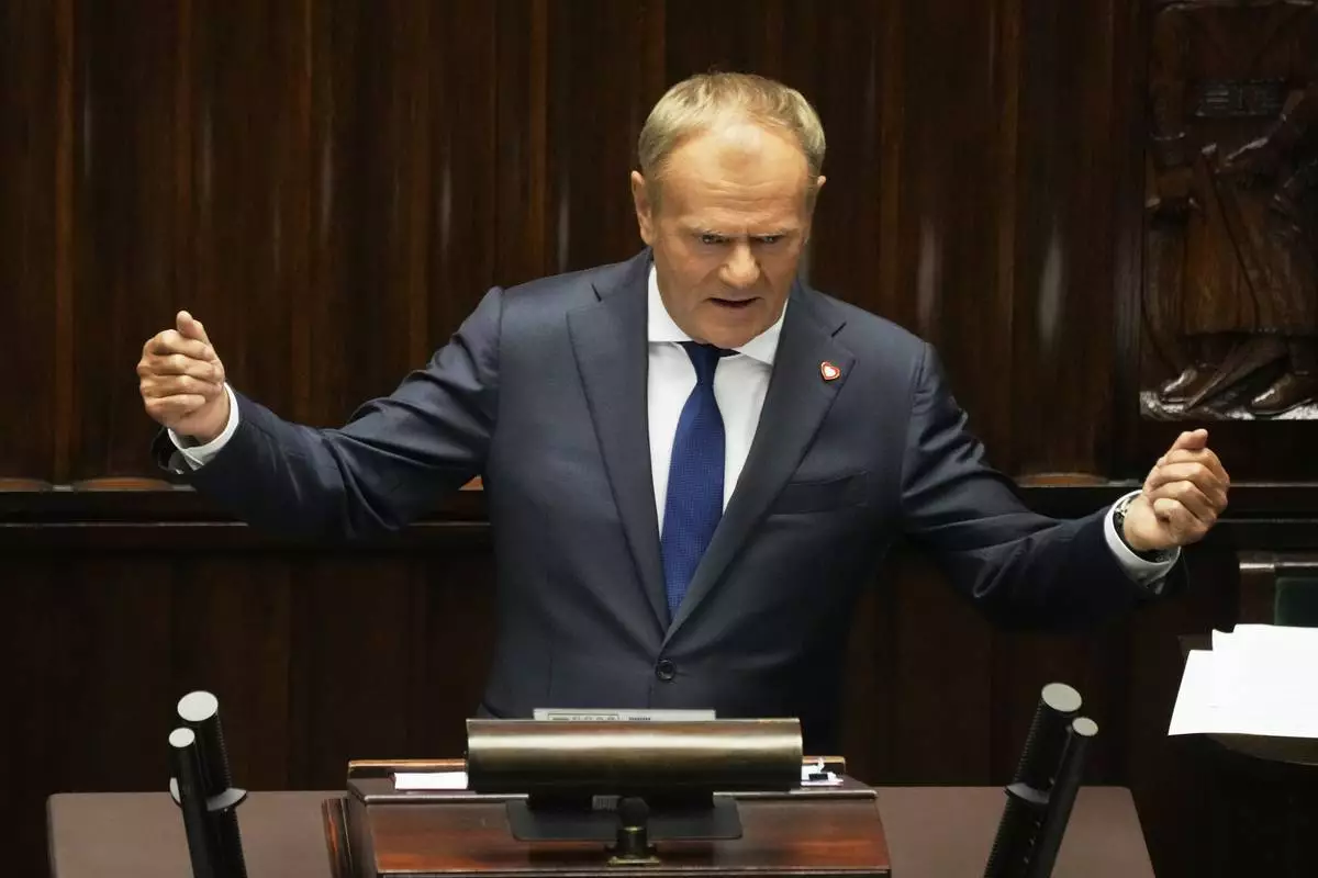 Poland's Prime Minister Donald Tusk addresses the Polish parliament on Wednesday, June 11, 2025, in Warsaw, Poland. (AP Photo/Czarek Sokolowski)