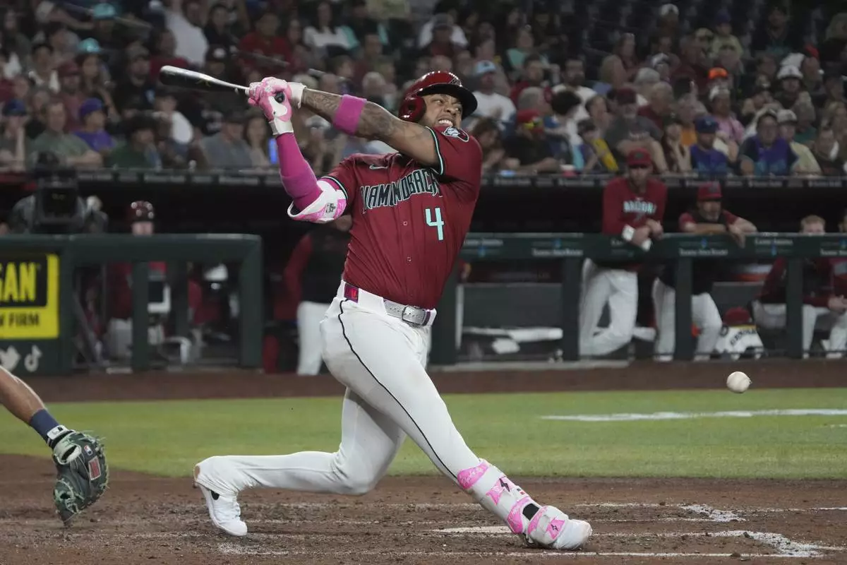 Arizona Diamondbacks' Ketel Marte hits an infield single against the Seattle Mariners in the fifth inning during a baseball game, Tuesday, June 10, 2025, in Phoenix. (AP Photo/Rick Scuteri)
