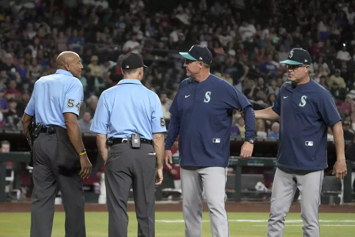 Seattle Mariners manager Dan Wilson, second right, is restrained by bench coach Manny Acta after having words with home plate umpire CB Bucknor (54) in the sixth inning during a baseball game against the Arizona Diamondbacks, Tuesday, June 10, 2025, in Phoenix. (AP Photo/Rick Scuteri)