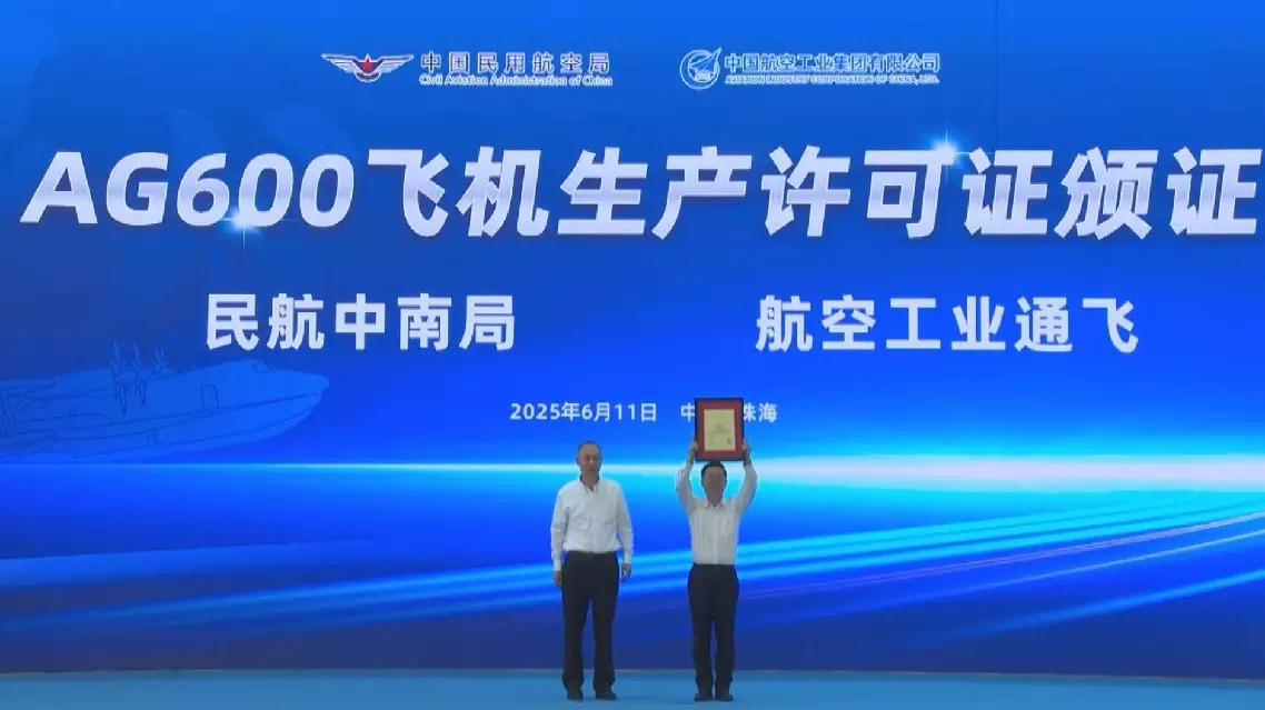 The AG600 received its type certificate, dubbed "birth permit," in April, confirming that the aircraft's design meets airworthiness standards. The newly awarded production certificate is a "manufacturing license," indicating that mass production has been officially authorized.