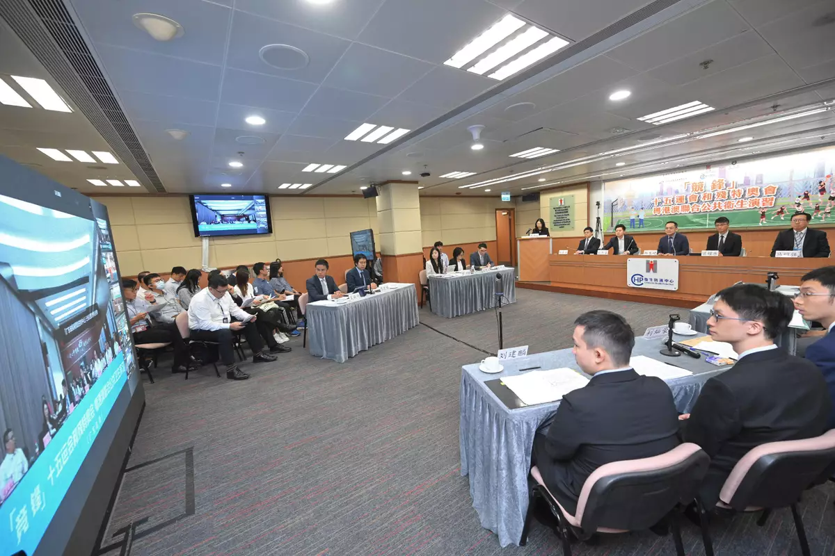 The Centre for Health Protection (CHP) of the Department of Health, in collaboration with the health authorities of Guangdong Province and Macao, today (June 11) conducted a public health exercise, code-named "Jingfeng", to enhance the capacity of the three places to co-operate in preventing and controlling communicable diseases during major sports events. The exercise was held in preparation for the 15th National Games (15th NG), the 12th National Games for Persons with Disabilities (NGD), and the 9th National Special Olympic Games (NSOG), which will be co-hosted by Guangdong, Hong Kong and Macao this November and December.