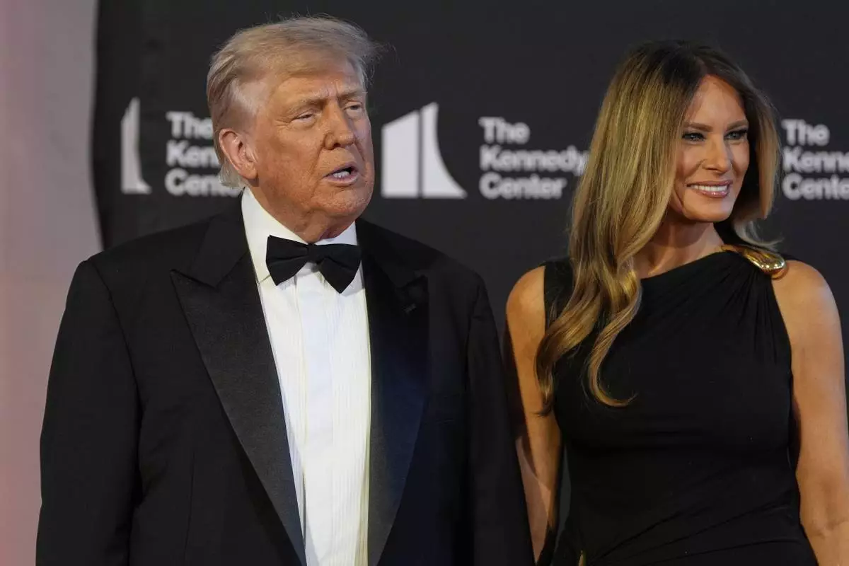 President Donald Trump and first lady Melania Trump arrive to view opening night of "Les Miserables," at the Kennedy Center, Wednesday, June 11, 2025, in Washington. (AP Photo/Alex Brandon)