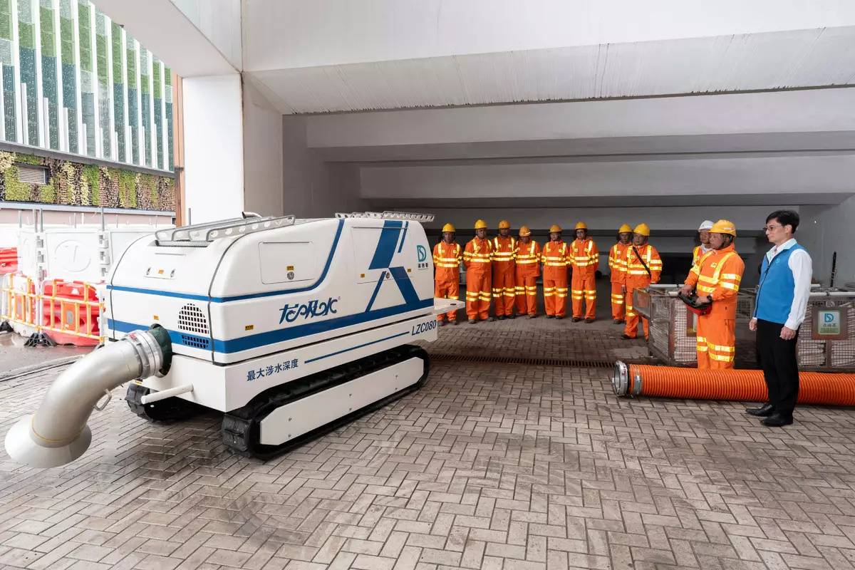 Mr Mok and the senior management team inspected several locations respectively, including the modular pumping system at Chai Wan Road roundabout, the installation of demountable flood barriers at Heng Fa Chuen, the divider holes at Lung Cheung Road carriageway in Wong Tai Sin, grid manhole covers, and the Pilot Scheme on Wading Line System. He also inspected the powerful pumping robots, Mobile Powerful Pumping Robot and Amphibious Pumping Robot, to ensure their readiness for operation.