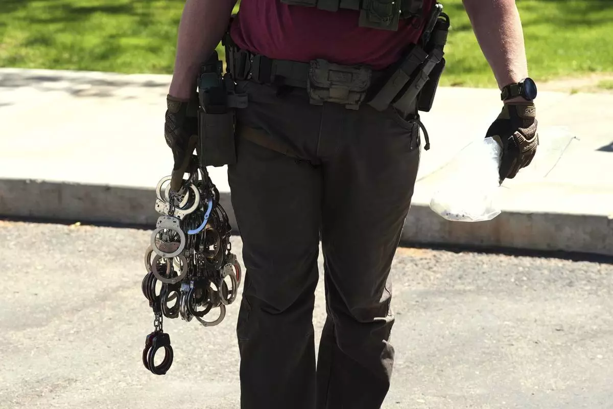FILE - A federal agent holds handcuffs outside immigration court, May 21, 2025, in Phoenix. (AP Photo/Ross D. Franklin, File)