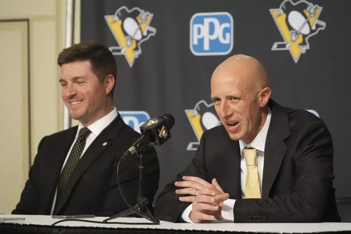 Pittsburgh Penguins new head coach Dan Muse, right, addresses media after being introduced by general manager Kyle Dumas, left, during an NHL hockey news conference, Wednesday, June 11, 2025, in Pittsburgh. (AP Photo/Gene J. Puskar)