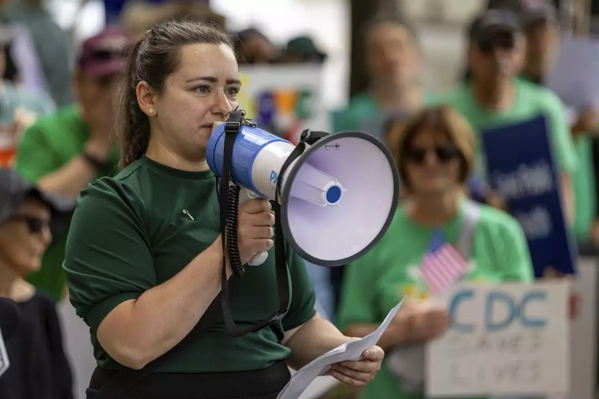 Anna Yousaf speaks at a demonstration protesting President Donald Trump's proposed cuts to health services outside Centers for Disease Control and Prevention (CDC) headquarters in Atlanta on Tuesday, June 10, 2025. (Arvin Temkar/Atlanta Journal-Constitution via AP)