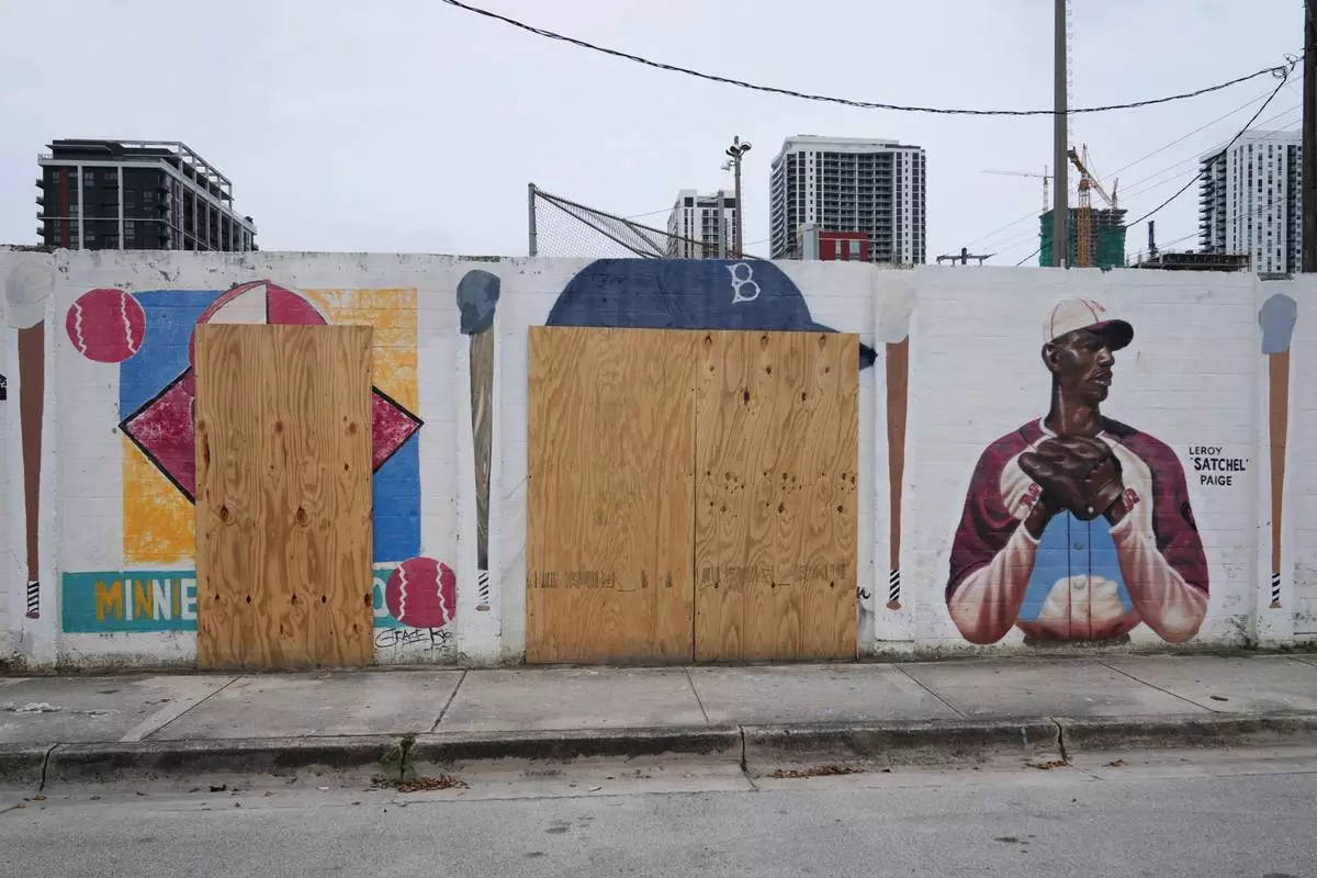 Murals of baseball legends Minnie Miñoso, second from left, and Jackie Robinson, third from left, are covered with plywood after being defaced in Miami's Overtown neighborhood, Thursday, June 5, 2025, in Miami. (AP Photo/Lynne Sladky)