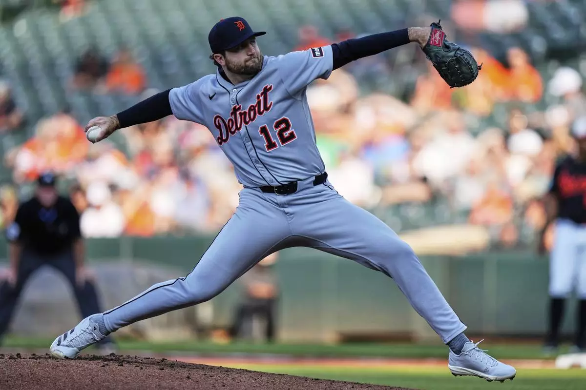 Detroit Tigers starting pitcher Casey Mize (12) delivers during the first inning of a baseball game Baltimore Orioles, Wednesday, June 11, 2025, in Baltimore. (AP Photo/Stephanie Scarbrough)