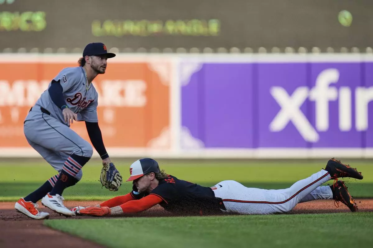 Baltimore Orioles' Gunnar Henderson, right, steals second base in front of Detroit Tigers shortstop Zach McKinstry, left, during the first inning of a baseball game, Wednesday, June 11, 2025, in Baltimore. (AP Photo/Stephanie Scarbrough)