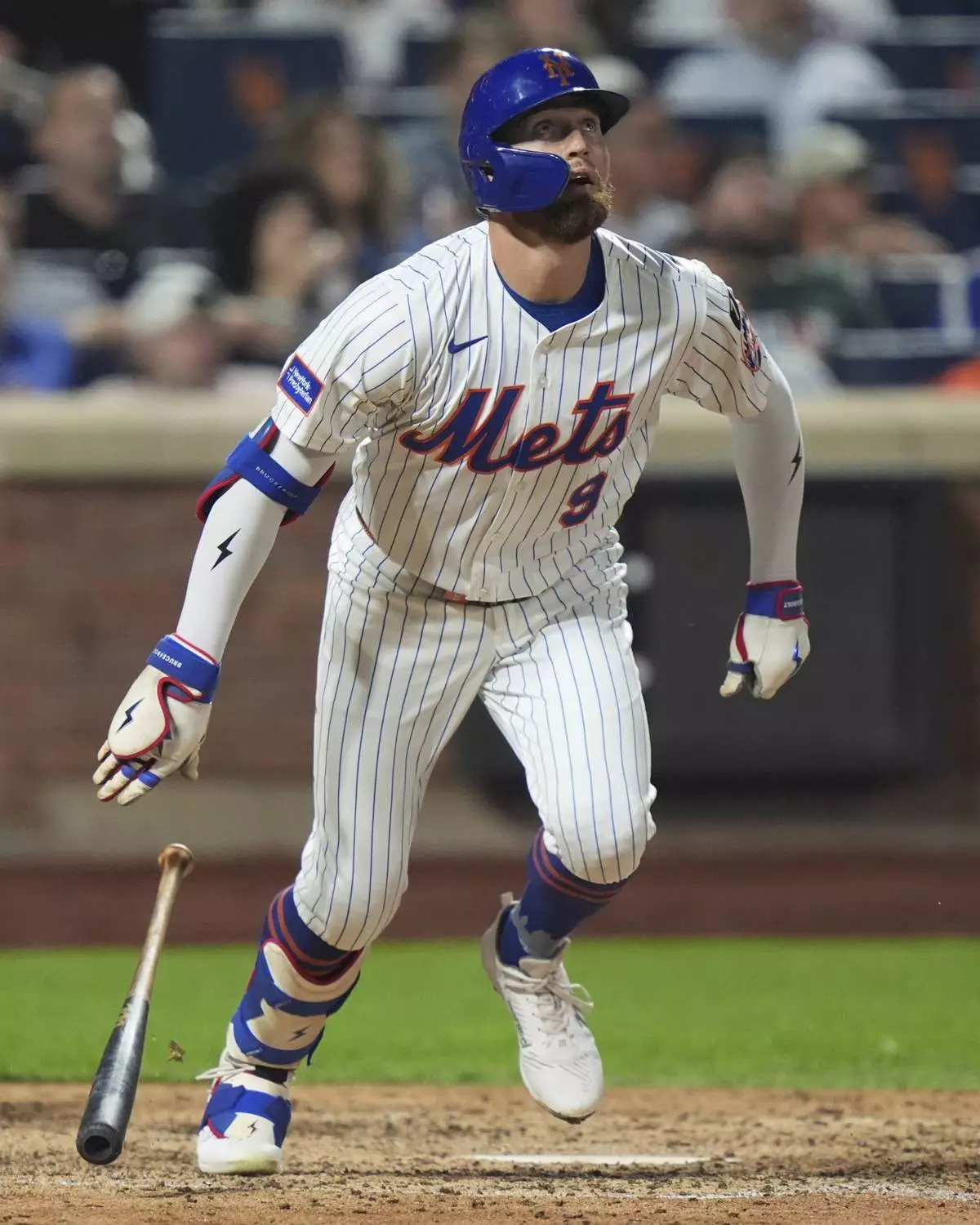 New York Mets' Brandon Nimmo follows through on a home run during the seventh inning of a baseball game against the Washington Nationals Wednesday, June 11, 2025, in New York. (AP Photo/Frank Franklin II)