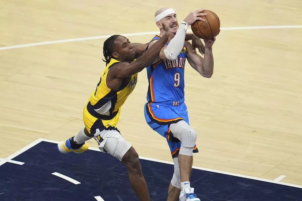 Oklahoma City Thunder guard Alex Caruso (9) drives as Indiana Pacers forward Aaron Nesmith defends during the second half of Game 3 of the NBA Finals basketball series, Wednesday, June 11, 2025, in Indianapolis. (AP Photo/Michael Conroy)