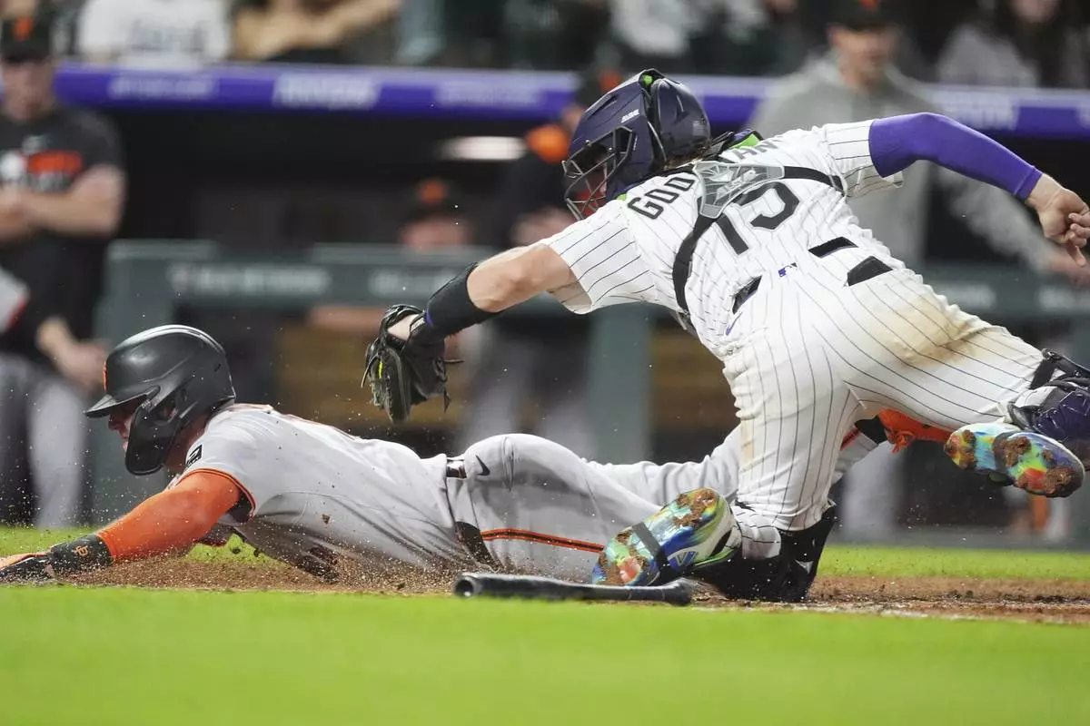 San Francisco Giants' Casey Schmitt, left, scores on a bunt single hit by Tyler Fitzgerald as Colorado Rockies catcher Hunter Goodman applies a late tag in the eighth inning of a baseball game Wednesday, June 11, 2025, in Denver. (AP Photo/David Zalubowski)