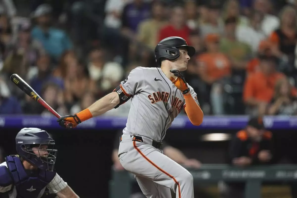 San Francisco Giants' Mike Yastrzemski follows the flight of his RBI single off Colorado Rockies relief pitcher Ryan Rolison in the ninth inning of a baseball game Wednesday, June 11, 2025, in Denver. (AP Photo/David Zalubowski)