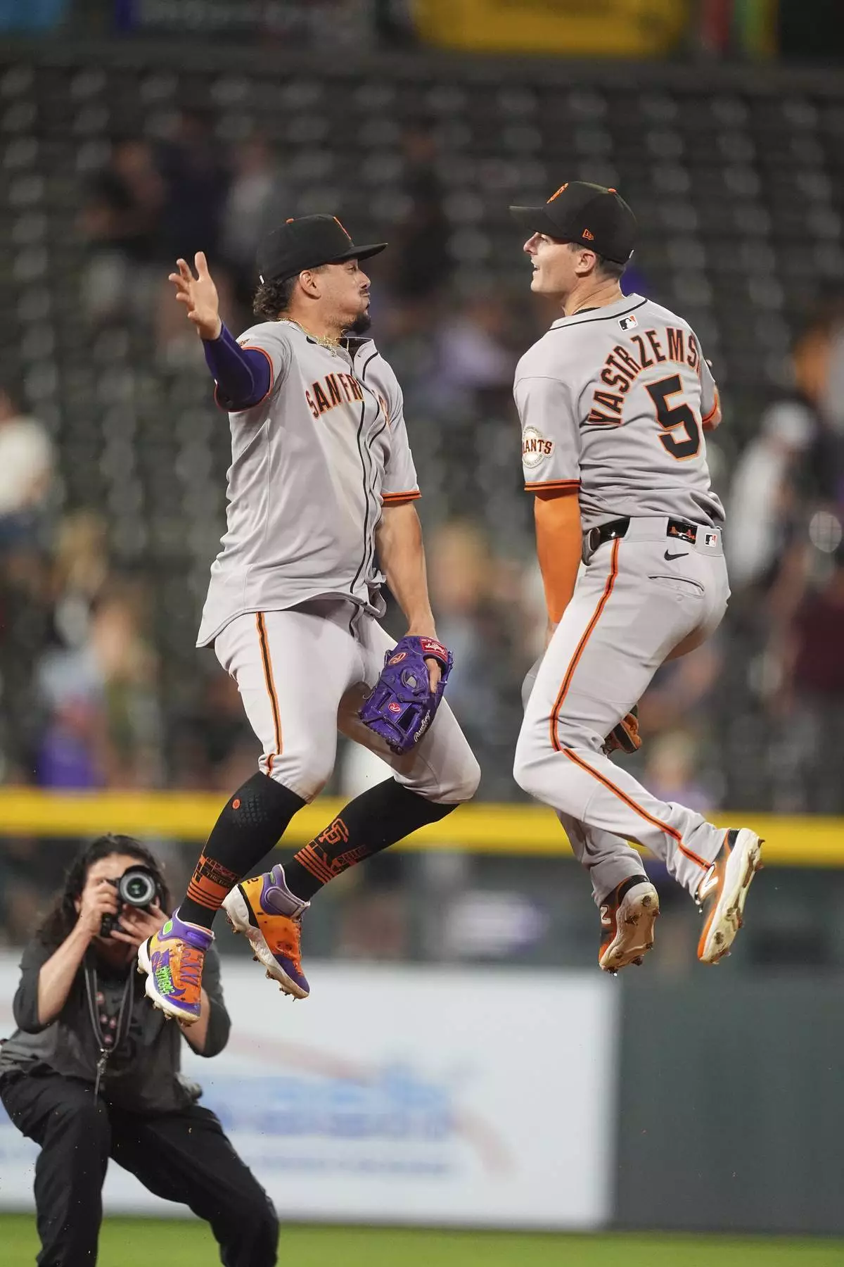 San Francisco Giants shortstop Willy Adames, left, and right fielder Mike Yastrzemski celebrate after defeating the Colorado Rockies in a baseball game Wednesday, June 11, 2025, in Denver. (AP Photo/David Zalubowski)