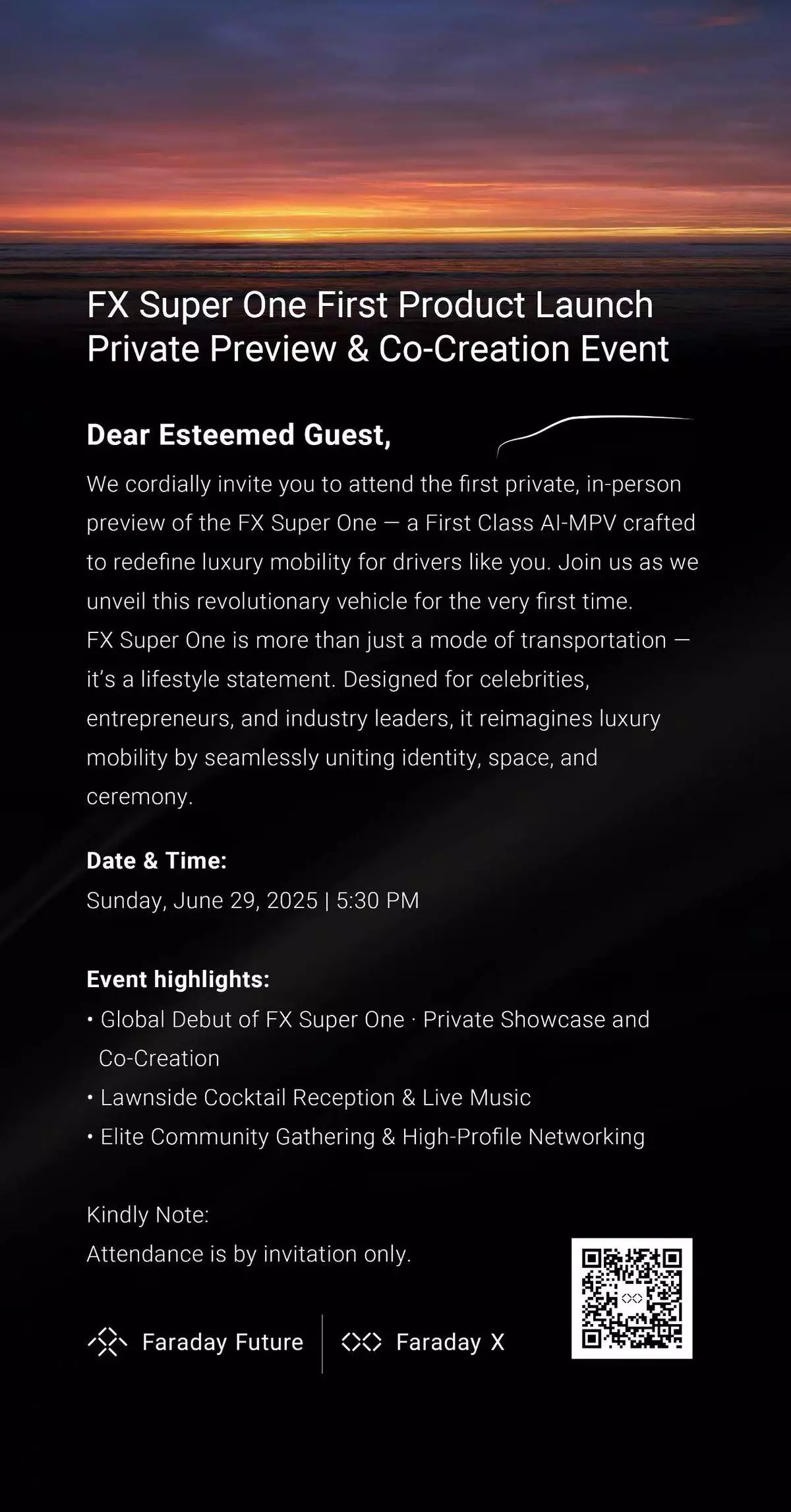 This intimate preview will offer attendees a first-hand look at FX Super One’s innovation, design philosophy, and market vision, while fostering meaningful co-creation among the minds shaping the product’s next phase. Following this event, the Company will host another large-scale public launch event on July 17, the Super One First Online Global Product Launch, open to audiences worldwide.