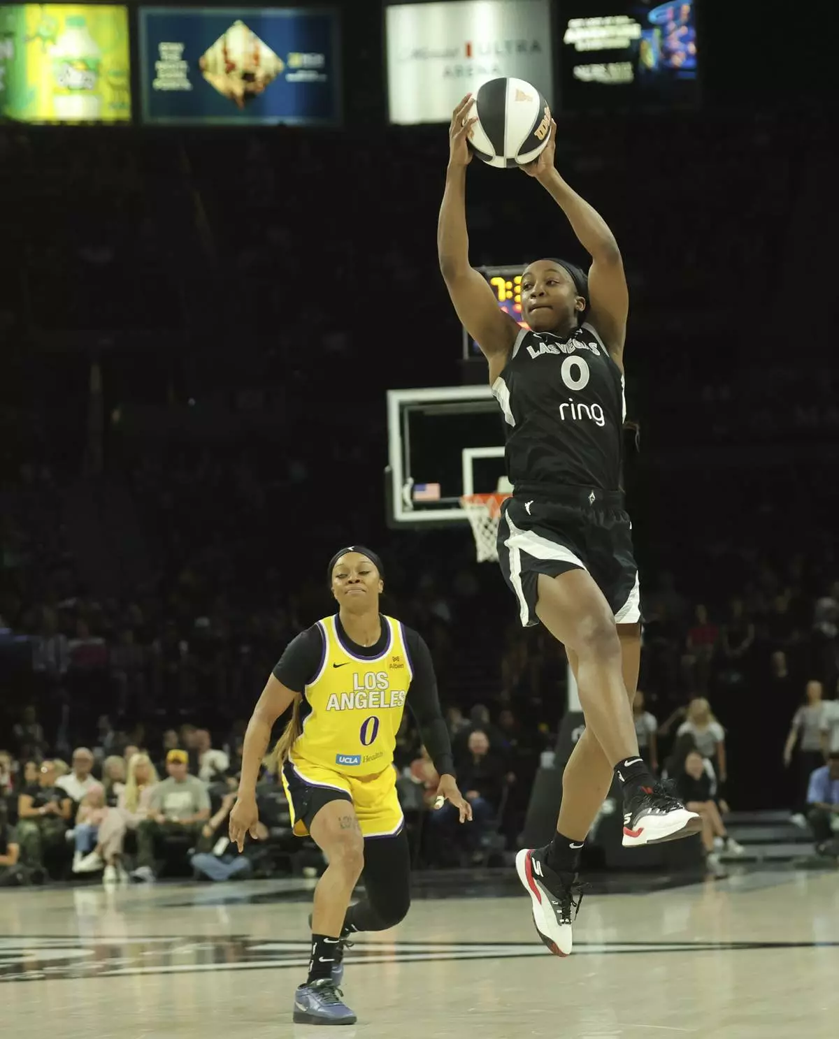 Las Vegas Aces guard Jackie Young (0) picks off a pass intended for Los Angeles Sparks guard Odyssey Sims (0) during the first half of an WNBA basketball game Wednesday, June 11, 2025, in Las Vegas. (Steve Marcus/Las Vegas Sun via AP)