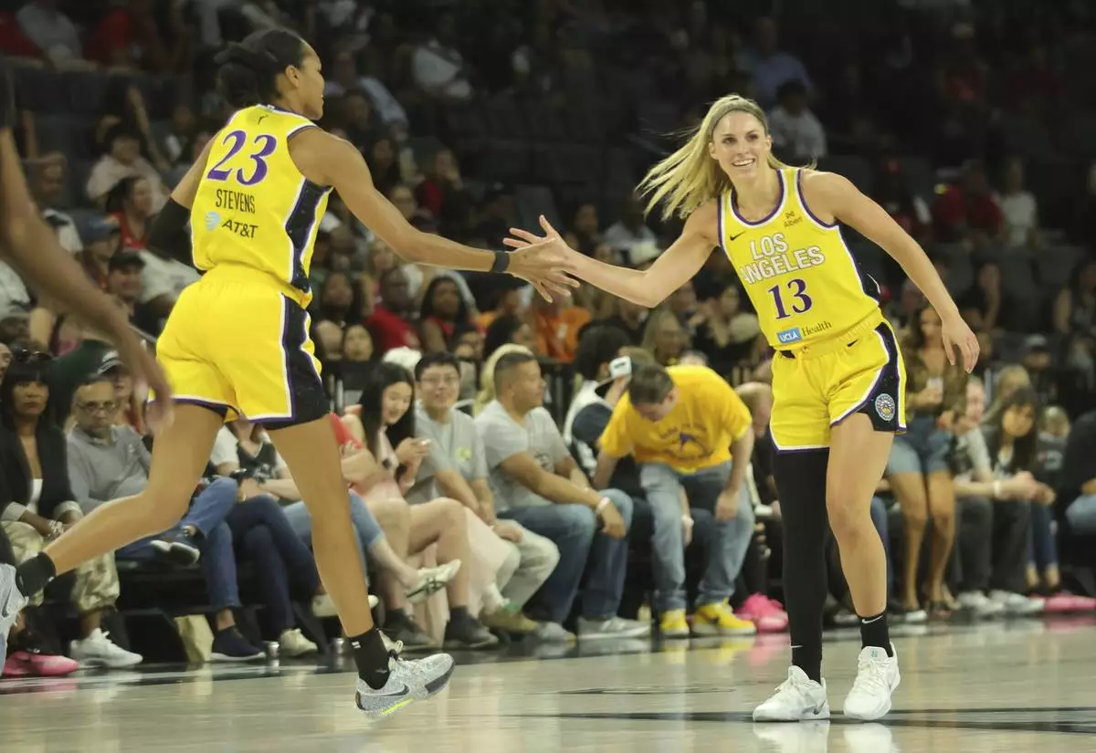 Los Angeles Sparks guard Sarah Ashlee Barker (13) is congratulated by teammate Azura Stevens (23) after making a three-point basket against the Las Vegas Aces during the first half of an WNBA basketball game Wednesday, June 11, 2025, in Las Vegas. (Steve Marcus/Las Vegas Sun via AP)